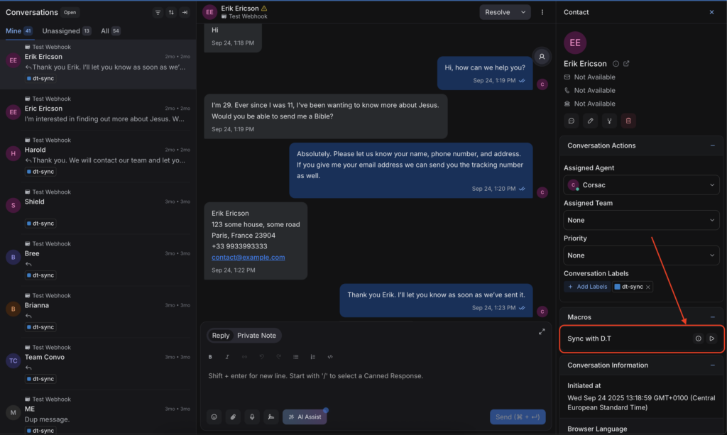 One-click sync to Disciple.Tools Click “Sync with D.T” and the contact plus full conversation history transfers automatically.