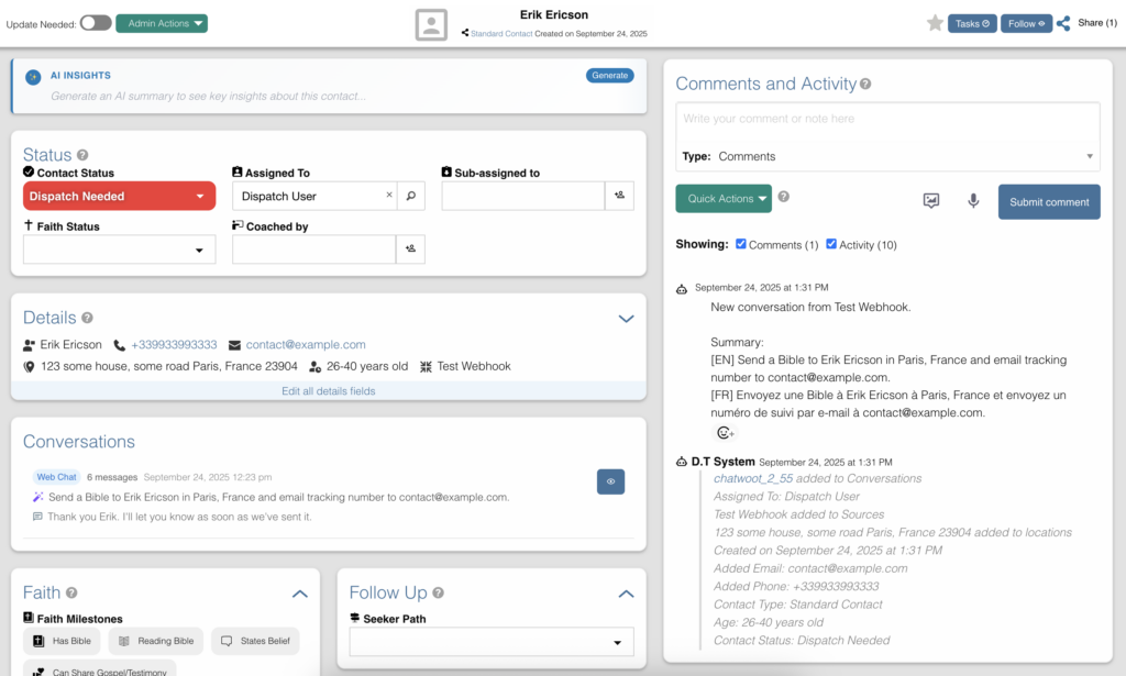 Connect with seekers on Facebook, Instagram, WhatsApp, and your website from a single dashboard. When they’re ready for follow-up, send them to Disciple.Tools with one click.