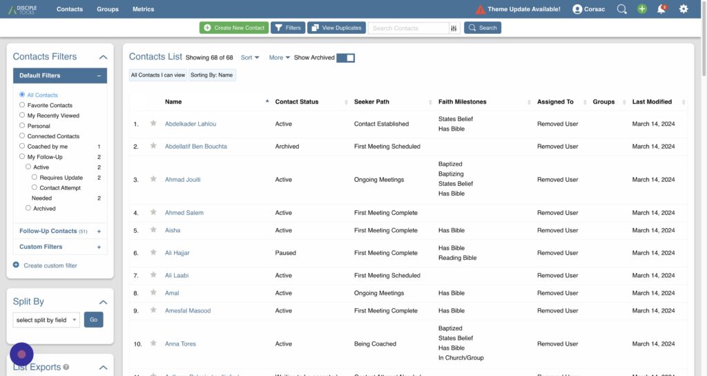 - Connection fields: Baptisms, Groups, Subassigned, etc